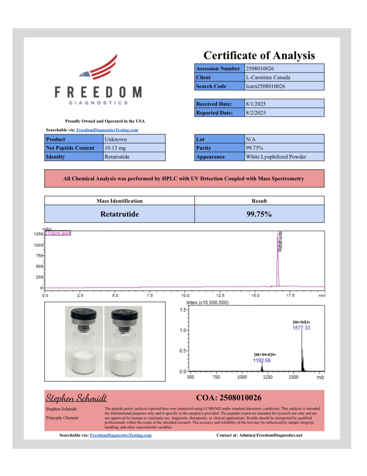Experience the future of weight management research with Retatrutide, a cutting-edge peptide known for its potential to support dramatic fat loss and metabolic enhancement. At L-Carnitine Canada, we supply lab-tested Retatrutide with 99% purity, trusted by researchers across Canada for its consistency and performance.